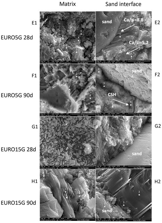 The increase in mucilage concentration (Figure 8) induces more and more morphological changes, confirming the arguments presented earlier. Image E1 shows that mucilage appears to influence CSH morphology since all the points analyzed in this image have Ca/Si values ranging from 2.2 to 2.9. At 90 days (F1), the evolution is notable, with Portlandite and CSH present. The matrix remains less dense than the reference matrix (B1) at the same age. The matrix/sand interface consists of Portlandite, as in mortar with less FM (C2). Indeed, image E2 shows Portlandite in two forms: one with a Ca/Si of 8.8 (close to the sand grain) and a Portlandite probably in the process of forming CSH, with a drop in Ca/Si = 5.2 (at distance of 6 μm from the sand grain). Finally, EURO15G shows significant carbonation (G1) not seen in the other samples. The matrix is filled with CaCO3 at 28 days (G1), whereas in the 90-day cure, the matrix consists mainly of Ca(OH)2, as the FM proportion is high. The observation of Ca(OH)2 in the matrix of the 90-day cure, when at 28 days CaCO3 was in the majority, has never been reported in the literature regarding low temperatures, but it is corroborated by Figure 7b showing that CaCO3 disappears in favor of Ca(OH)2.