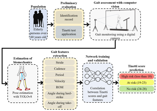 The general methodology shown in Figure 1 was followed in the development of this work. It starts with the selection of the population, which focuses on the evaluation of people over 60 years of age who meet the inclusion and exclusion criteria. For each participant, an identification form is generated with basic information such as age, height, weight, and other data. This information is complemented by the application of the Tinetti tests to assess their fall risk, the result of which is taken as ground truth and used as a reference. Next, a gait assessment is performed using a computer vision system, which consists of a digital camera that monitors walking on a treadmill at a comfortable speed. This is analyzed to estimate the biomechanics of the lower extremities, from which the gait main features are extracted, such as stride length, cadence, period, and range of motion (ROM), to name a few. Then, the extracted features are used to train and validate an artificial neural network (ANN) that seeks a correlation between the features and the Tinetti score; as a result, the final system can predict the Tinetti score of new cases via gait analysis.