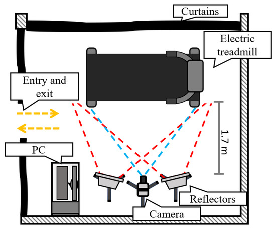 To perform gait evaluation with the vision system, a controlled work environment is set up, as shown in the diagram in Figure 2, which shows an enclosed room with an electric treadmill used by the subjects. The area is isolated from the rest of the clinic by dark curtains that prevent the entry of ambient light; instead, infrared reflectors are placed to maintain a controlled and constant illumination [33]. Controlling the working environment simplifies the preprocessing required for image analysis, as there is no need to isolate objects or people unrelated to the tests. In the same way, it is possible to visualize any movement of the lower extremities. The reflectors are placed at 1.7 m from the treadmill, as well as the vision system camera and the PC used to coordinate video acquisition. The final layout of the workspace is designed to ensure that the subjects are not at risk of falling and that it is easy to enter and exit the test area.