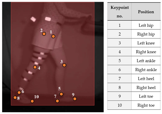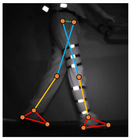 Once all the images have been labeled, CVAT generates a database containing information about the boxes and points placed, such as their position and dimension. These points are then exported to Python, where they are used to train a DL model. For the development of the algorithm, the use of the open-source library Keras in Python was chosen, which is designed for the training and implementation of DL models [36,37]. These models can be used both for the development of neural networks for the analysis of statistical databases and for the training of models for the analysis of images, which perform tasks of detection of objects, people, faces, and body orientation, to name a few. Therefore, using Keras and the database obtained from CVAT, the training of personalized models is performed, where the information and images are divided for training and validation. The resulting model is then used for the analysis of gait test videos, where each frame is taken to perform the identification of each lower limb section via key points. This results in an estimate of the subject’s pose within the frame, as shown in Figure 4, which, when monitored over time, generates signals representing the biomechanics of walking.