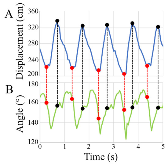 Finally, the knee angle during toe-off and heel strike is determined by superimposing the angular knee displacement and ankle displacement signals on the x-axis, as shown in Figure 5.