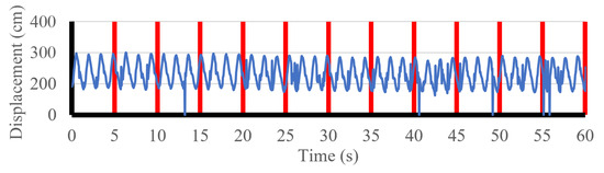 Based on the results of Section 3.1, information is collected from the 86 subjects who met the exclusion criteria and had their Tinetti test results. To add to the database, the videos are divided into 5 s windows, segmenting the signals as shown in Figure 6. In this way, samples with 5 to 9 steps are available, which is sufficient for calculating the indicators proposed in Section 2.6.