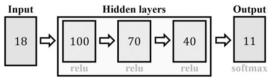 For the final model, ReLU was chosen, which showed a performance superior to the rest, in addition to a consistent performance when using cross-validation. Figure 7 shows a diagram of the algorithm structure with ReLU as the hidden layer activation function and softmax as the output layer.