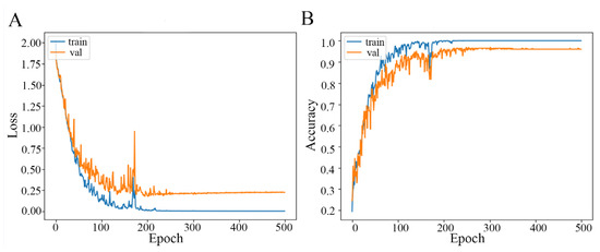 Graphs obtained from the training and validation of the ANN. (A). Loss. (B). Accuracy.