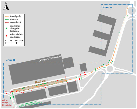 The considered K&F area is located in the airport surface access of Kraków Airport. Taking into account the fact that to reach this part of the landside area as well as the road network organisation near the airport itself could also create a challenge for drivers, it was decided to consider the approach to the airport ground access separately when planning the field study. The scheme in Figure 1 shows the approach to the airport landside marked as Zone A and the airport ground access marked as Zone B. The boundary between the two zones is associated with the moment when drivers start to see the entrances to the landside of Kraków Airport. The scheme includes also a planned travel path trajectory and, as was mentioned above, important elements of the traffic organisation—road signs dedicated for drivers along this route as well as road signs, which are visible when driving the planned route.