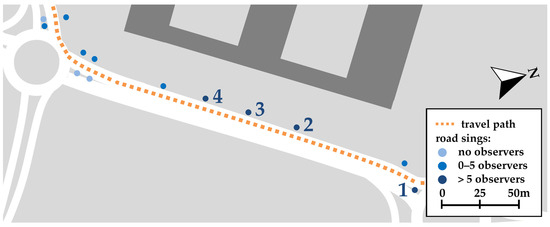 As it was declared above, the main focus of this study is signage and especially road signs. To better understand the area of the field study, all road signs along the travel path were assessed by using a scale presented in Table 1. It should be mentioned that to make this assessment, recordings from the dashboard camcorder together with field observations were used. This protocol was used before and is considered by authors to be reliable [41,42]. Only one simplification was carried out: signs situated on the same post were assessed together because they were always observed together by participants.