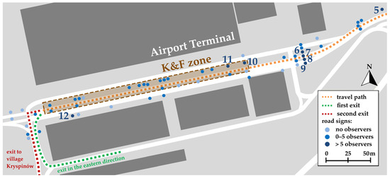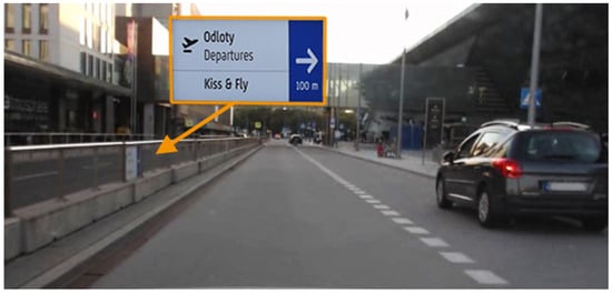 A separate issue of the exit from the K&F zone is road sign number 12 (Figure 10). Although this sign is dedicated for drivers using the roadway leading directly to long-term car parking, it was observed by seven drivers from both Group I and Group II. Maybe it attracted their attention because of its size and/or its configuration, but in any way, such a situation should not be considered a normal one.