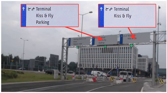 In the case of the K&F zone itself, the information signs above the divider separating the K&F zone from the roadway leading directly to long-term car parking should be mentioned (Figure 8). Five signs located every 20 m indicate the distance which passengers should cover to reach the second half of the terminal—the area of departures.