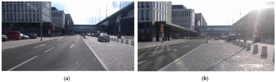 Besides the above-mentioned road marking arrows, a dashed line dividing lanes from the left and right gates can create a separate confusion. This dashed line was painted on the edge of paver blocks, which, under sunny (glare) conditions, makes it look like a continuous line or even blends into such a surface. Because drivers recognize road markings based on the visibility level, which is provided by the contrast against the neighbouring surface [43] and could be estimated by using the contrast ratio (CR) measured through luminance [44], the calculation of the Michelson CR (CRM) was carried out to confirm this effect here. As shown in Figure 6, three areas were selected: the painted part of the dashed line as a white marking, the road surface between painted parts as a space and road surface of paver blocks near the dashed line as a background. Figure 6a presents cloudy weather conditions as a good one and Figure 6b—sunny weather with the presence of sunshine glare, which is considered as critical visibility conditions [44,45]. When calculating the CR between a white marking and a space, the CRM values are 0.05 and 0.00 during good visibility conditions and glare, respectively. Such small values confirm the fact that the considered dashed line could look like a continuous one, especially in the glare conditions. The CRM values between elements of the dashed line and a background are also very low: 0.10 and 0.06 for good and glare conditions, respectively. This means that horizontal road marking could really blend with the surface (as, for example, can be seen in Figure 6b with the right edge line and arrows—the CRM values in both cases are 0.00) and in such a way create a problem for drivers.