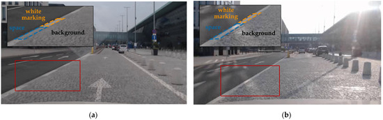 Road section with paver blocks leading to the K&F zone (places in the red rectangles were zoomed in the left side of images): (a) cloudy weather conditions; (b) sunny weather conditions with the presence of sunshine glare.