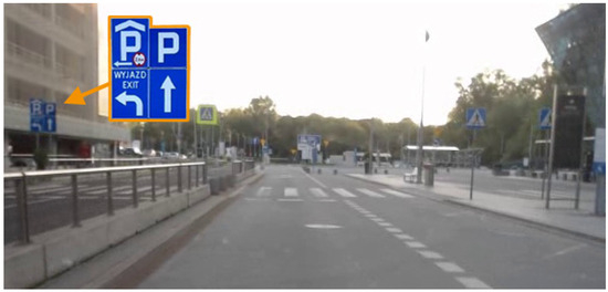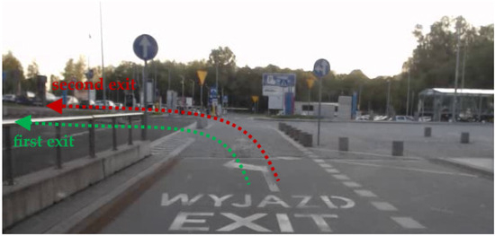 As it is possible to see in Figure 9, there were two mandatory signs (one on the left, obligating drivers to go only straight ahead and dedicated for drivers who use another lane, and one on the right, which obligates drivers to go only left or straight) and two road marking arrows (one located closer, which is marked with the words ‘WYJAZD’ and ‘EXIT’ and obligates drivers to turn left, and one located further, marked with the letter ‘P’ and obligating drivers to go only straight). All these four elements were observed by participants and could impact on drivers’ decisions when selecting an exit. Here, it is important to point out two aspects. Firstly, the right road sign and ‘turn left’ arrow are formally in conflict, and according to Polish traffic law, the first one has priority—the second one should be ignored by road users. Secondly, the sunshine glare conditions influenced significantly on the visibility of road marking arrows: the CRM of the ‘turn left’ and ‘go straight’ arrows decreased from 0.20 and 0.13 to 0.14 and 0.03, respectively, which confirm again the impact of road surface materials on contrast (asphalt vs. paver blocks).