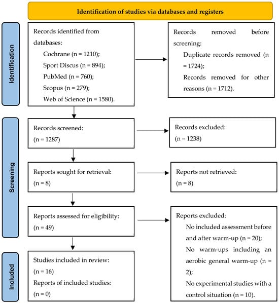 The specific inclusion criteria were: (1) studies analysing the effect of different stretching in the warm-up, on a vertical jump or lower-limb ROM; (2) studies that included assessment before and after warm-up; (3) warm-ups including an aerobic general warm-up followed by SS or DS; (4) experimental studies with a control situation; and (5) studies carried out on adult men and/or women (≥18 years) without pathologies or health problems. Studies were excluded if they: (1) were review articles, editorials, letters to the editor, or case reports; (2) were not performed on humans; (3) were not available in English or Spanish; and (4) did not provide or detail numerical data on the specified variables.