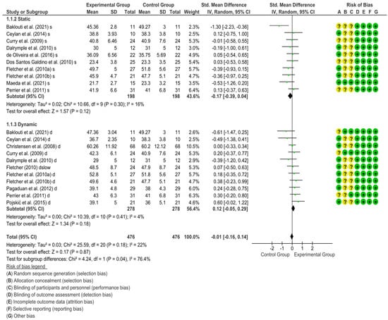 Meta-regression analysis (Table 3) showed no significant interactions between the study’s dependent variables and potential moderating variables. In addition, when heterogeneity was analysed without differentiating the type of stretching used during the warm-up (Supplementary Table S1), heterogeneity was observed. Moreover, the funnel plot did not show a significant asymmetry in CMJ (Egger’s test: static = −1.8, p = 0.113; Dynamic = 1.3, p = 0.235). However, Egger’s test showed significant heterogeneity. Nevertheless, the test should not be applied to variables with <10 studies. The sensitivity analysis revealed that the results retained their magnitude and significance after analysing the results when each of the included studies was removed one by one.