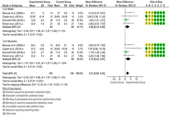 Regarding ROM, an increase was observed after SS (SMD = 0.40, 95%IC [0.05, 0.74]) and DS (SMD = 0.48, 95%IC [0.13. 0.83]) stretching when compared to the control intervention. However, no differences were observed (p = 0.73) between static and dynamic stretching (Figure 3).