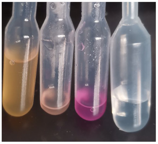 Color changes over time in celestial goldfish sperm preserved with phenol red Hank’s solution at4 °C. Note: From left to right: The color changes of in goldfish sperm preserved in phenol red Hank’s solution at 40 h, 27 h, and 17 h respectively, alongside the color of tap water used as a control.