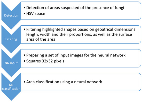 The inspection algorithm includes the following image processing steps. The first stage is carried out on color images in an HSV space (the model for describing the color space containing Hue, Saturation, and Value components). Based on the pixel values, areas that may contain blue stain are pre-selected. The second stage is the filtration of the highlighted areas based on their geometric properties such as length, width, their proportions, and surface area. The third stage is preparing the set for the neural network. The input images are in the shape of a square with dimensions of 32 × 32 pixels. The images partially overlap, i.e., their margins contain common parts of the source image. The fourth stage is classification using a neural network. The system operates a set of neural networks dedicated to detecting individual wood defects. This article discusses a neural network designed to detect blue stains; other defects are not cross-detected. The algorithm’s operation diagram is shown in