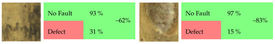 Another series of 100 boards (25%) was prepared (50 pcs, defective and 50 pcs, not defective). This stage verified whether detection based on color components covers all areas covered by a blue stain, i.e., whether no blue stain was missed. If it turns out that one board has a blue stain that has not been marked (1% of the sample), then the color component thresholds are corrected.