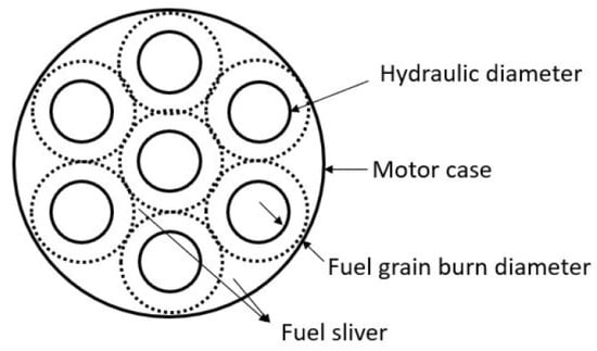 To determine the theoretical characteristic exhaust velocity () and specific heat ratio (k) for the reaction gases of the LOX/HTPB combination, a function of the mixture ratio is employed []. In the optimization study, the solution for the optimization problems incorporates a circular F grain port, as depicted in Figure 2. This choice is motivated by the ease of the production process and computational convenience. In the optimization process, the outside diameter of the modified vehicle is derived from the non-modified launch vehicle to prevent conflicts with the lower stages. The calculation of T coefficients is based on propulsion fundamentals [].
