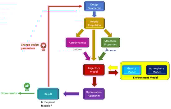 The optimization problem for launch vehicles, specifically those with a modified last stage featuring hybrid propulsion, falls into the category of multi-objective design optimization. The subsystems within the launch vehicle are interrelated and exhibit coupling effects. For instance, the center of gravity location and inertia properties are calculated based on the new geometry obtained from CATIA, using the optimization design parameters. To ensure effective and realistic applications, the use of multi-objective multidisciplinary design optimization (MDO) algorithms is crucial for achieving more efficient and accurate optimization [,,]. The flowchart outlining the multi-objective MDO approach and the interaction of the subsystems employed in this study for an example application of the Minotaur-I launch vehicle is depicted in Figure 3. This flowchart is not only applicable for the Minotaur-I launch vehicle but can also be utilized and generalized for other launch vehicles. In the flowchart, the optimization process begins with the determination of optimization design parameters to maximize the performance of the launch vehicle. This process starts with the identification of key elements, such as initial expansion ratio, initial chamber pressure, throat diameter, and thrust vector control of the first and last stages, which are optimization design parameters for the problem. Subsequently, the parameters relevant to these are calculated for the hybrid propulsion system. Then, the structural and aerodynamic features of the launch vehicle, whose geometric properties are computed, are calculated using software such as DATCOM Version 6 and CATIA V5R19. The trajectory of the launch vehicle is determined using calculated aerodynamic, structural, and propulsion subsystems along with environmental models such as gravity and atmosphere. Results obtained after each optimization step are stored, and an optimization algorithm is employed to optimize the performance of the launch vehicle. The obtained solution is determined through a fitness check to ascertain whether it meets design constraints such as targeted orbit parameters. If not, the optimization design parameters are adjusted, and the optimization process is iterated. Ultimately, upon completion of this comprehensive process, the launch performance of the launch vehicle is successfully optimized.