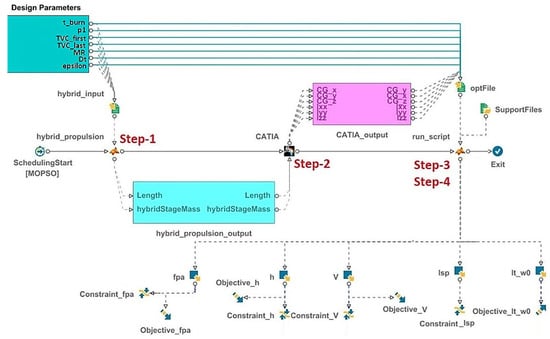 where MR represents the initial mass ratio, tburn represents burn time, Dt represents throat diameter,  represents the initial chamber pressure,  represents the initial expansion ratio, and TVCfirst and TVClast represent the TVC angle of the first and last stage, respectively. The optimization design parameter primarily contributes to process and performance enhancement, while the launch vehicle design parameter plays a role in determining the physical structure and functionality. The optimization design parameters can play a dual role, serving as inputs both in the propulsion system and along the trajectory calculations, providing information about the launch vehicle’s performance and efficiency. The optimization parameters were assigned lower and upper limits as follows: 0 ≤ TVCfirst ≤ 6°, 1 ≤ TVClast ≤ 3°, 20 ≤ tburn ≤ 60 s, 2 ≤ p1 ≤ 4 MPa, 1 ≤ MR ≤ 3, 7.5 ≤ ϵ ≤ 11, and 0.065 ≤ Dt ≤ 0.15 m. The lower and upper limits were chosen to ensure physical feasibility. The trajectory properties of h, V, and γ serve as both objective and constraint parameters to optimize the operation effectively and efficiently. When objectives are also entered as constraints, especially because the targeted orbit parameters need to be met, it guides the algorithm to find solutions closest to these parameters. The optimization process aims to minimize or maximize the objective functions while satisfying the constraints and requirements to obtain a feasible solution. For this study, the modeFRONTIER 2019R1 optimization software is utilized as a multidisciplinary optimization solver, equipped with an automatic framework []. The flow scheme of the multi-objective multidisciplinary optimization process, along with the steps involved in solving the optimization problem, is illustrated in Figure 4. In Figure 4, tburn, p1, TVCfirst, TVClast, MR, Dt, and epsilon in the design parameters represent tburn, p1, TVCfirst, TVClast, MR, Dt, and ϵ, respectively. The process begins with “SchedulingStart”, indicating the initiation of the optimization routine using multi-objective particle swarm optimization (MOPSO), a technique for solving problems with multiple objectives. Under the heading “Design Parameters”, a compilation of variables amenable to modification during optimization is presented, encompassing parameters such as burn time, chamber pressure, TVC angle of the first and last stages, mass ratio, throat diameter, and expansion ratio. These parameters serve as inputs to the optimization process and are subject to iterative adjustments aimed at identifying the optimal solution. The workflow then moves to a script, suggesting a computational step, to calculate initial values and prepare data for optimization. At this stage, MATLAB scripts are employed, primarily for computations related to hybrid characteristics utilizing the optimization design parameters, thus aligning with the overarching objectives and constraints. The calculation steps involved in this study cover various aspects, including hybrid rocket propulsion, CATIA-based structural properties such as mass and inertia characteristics, aerodynamic characteristics, and trajectory determination, which are systematically executed. The initial phase of the optimization process involves the calculation of hybrid rocket propulsion characteristics. Subsequently, the obtained motor length and hybrid stage mass serve as inputs for the structural model, created using parametric shape design in the CATIA program. In this stage, the values for the center of gravity and moment of inertia, which vary as stages are ejected and propellant is consumed, are determined for the entire launch vehicle and its stages. All the pertinent information is then iteratively integrated into the flight mechanics 6DOF model within the optimization main file until feasible solutions are achieved, satisfying the specified constraints and objectives. Within the 6DOF simulation, the subsystems of aerodynamics, propulsion, structure, and trajectory are intricately interconnected. This interdependence signifies that the outputs produced by the propulsion subsystem serve as inputs for both the trajectory and structural subsystems. Downstream from the MATLAB step, the workflow branches into objectives and constraints. The objectives prefixed with “Objective”, such as “Objective_fpa”, “Objective_h”, and “Objective_V”, represent the desired outcomes for the flight path angle, altitude, and velocity, respectively. The constraints prefixed with “Constraint_”, such as “Constraint_fpa”, “Constraint_h”, and “Constraint_V”, denote the limits and requirements that the optimization process must not break for the flight path angle, altitude, and velocity. The process concludes with an “Exit” node, signaling the end of the optimization routine, after which the best solution or set of solutions may be selected based on the objectives and constraints defined. This flowchart provides a structured representation of the optimization process, highlighting the parameters involved, the computational tools employed, and the performance metrics that guide the search for an optimal design and trajectory of the launch vehicle.