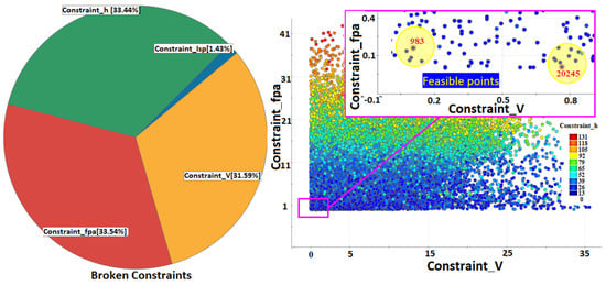 Upon successful completion of the optimization process, feasible designs and the corresponding broken constraints are acquired. These results are presented in Figure 5, where each bubble with a red foreground marker represents a feasible solution. Due to the complexity of the multi-objective multidisciplinary problem, the plot specifically showcases the minimum flight path and minimum V error constraints. Furthermore, Table 4 provides the properties of the feasible points displayed in Figure 5. The broken constraint pie chart illustrates the percentage values at which constraints are broken for all design points obtained throughout the entire optimization process. This enables an assessment of which constraint is more challenging.