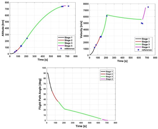 Observing the broken constraints in Figure 5, it can be noted that the γ, h, and V constraints are broken to a similar extent in the broken constraint percentages, while the  constraints exhibit smaller deviations compared to other constraints. In this problem, it is indicated that all constraints, namely γ, h, and V, are equally important for achieving the required orbital parameters to place the payload into the targeted orbit. If any of these constraints are not met, the payload cannot be placed into the targeted orbit. This highlights the challenge of simultaneously satisfying all these constraints. On the other hand, aiming for a higher specific impulse than the solid-propelled original stage (287 s) is less restrictive relative to other constraints, and limits on design points with lower specific impulse have been broken. Therefore, while it can be stated that performance improvement is achieved with an  value greater than 287 s, it can be explicitly expressed that the mission is unsuccessful when any of the orbital parameters cannot be fulfilled. As a result, a few feasible points are obtained in the optimization solution. A Pareto optimal point represents a solution in multi-objective optimization where no further improvement in one objective can occur without compromising another. This concept enables decision-makers to explore trade-offs and identify balanced solutions that maximize multiple objectives simultaneously, offering a comprehensive and efficient approach to complex optimization problems. As Design ID 20245 points to a Pareto optimal solution, the results of Design ID 20245 in this study were compared with the original Minotaur-I launch vehicle. Figure 6 provides the comparison of trajectory, velocity, and flight path during the flight for the optimization results of Design ID 20245 for the hybrid last stage, along with the reference points of the solid last stage, for the Minotaur-I launch vehicle [].