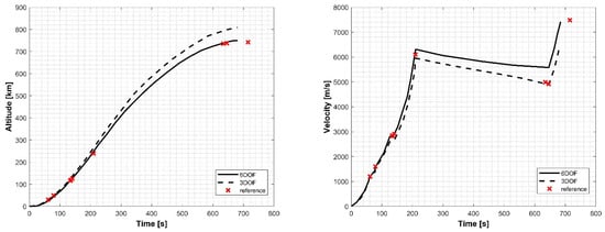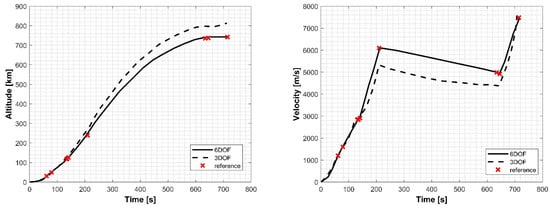 The percentage differences in altitude, velocity and flight path angle in flight mechanics when using a 6DOF model are generally smaller compared to those using 3DOF, especially for complex maneuvers and simulations that involve precise positioning and interactions with the environment []. For advanced flight simulations, such as those used in aerospace engineering, a 6DOF model is preferred because it can provide highly accurate results, often within a few percentage points of reality. For example, Brochu and Lestage indicate that the relative error between the 3DOF and 6DOF models for maximum range envelope calculations is 3% and 12% at altitudes of 1 and 15 km, respectively []. Therefore, as the flight simulation time increases, the difference between 3DOF and 6DOF models will gradually become more pronounced. To demonstrate the accuracy of the results, we compare the 3DOF and 6DOF simulations obtained for the same design point, Design ID 20245, and the original Minotaur-I launch vehicle, and discuss the differences between these simulations. A comparison is made with the results of Design ID 20245, as it provided results quite close to the reference values given for the trajectory of the original Minotaur-I launch vehicle, and this study aims to examine the difference between the 3DOF outputs and those of 6DOF. The altitude and velocity graphs obtained over time from the 3DOF and 6DOF simulations are presented for the hybrid last stage as the output of the optimization process in Figure 7, and for the original solid last stage that is taken as the reference data of the Minotaur-I launch vehicle in Figure 8, and the percentage differences  between the target altitude and velocity are given in Table 7 and Table 8, respectively.