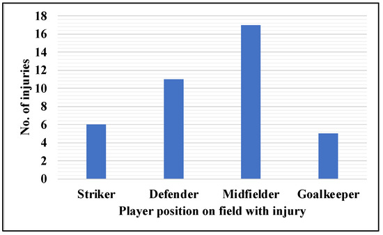 Among the 104 football players representing five teams, 39 players (37.5%) disclosed a history of prior knee injuries. Detailed injury distribution is presented in Table 1, elucidating severity, timing, and mechanisms. Muscle injuries constituted the most prevalent type, making up 61.5% of all reported injuries, predominantly occurring during training sessions. Conversely, other injuries, such as fractures or patellar injuries, were less frequent, making up 7.7%. Among muscle injuries, quadriceps and hamstring injuries showed equal prevalence. Ligamentous injuries followed (25.6%), with ACL being the most common, succeeded by meniscus injuries (17.9%), among which medial meniscus injuries prevailed. Non-contact injuries constituted the majority, accounting for 59% of reported cases. The distribution of injuries in terms of players’ field positions is illustrated in Figure 1. Regarding intervention types, results reveals that 23.1% of participants opted for surgical intervention, with all injured players undergoing physical therapy rehabilitation. On average, participants returned to sport after 69.89 days, with a standard deviation of 100.83.