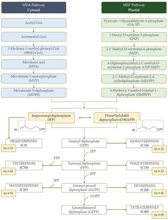 Among the natural products, terpenes and their derivatives, i.e., terpenes containing different functional groups (also known as terpenoids), are the largest and the most diverse group of plant secondary metabolites (SMs). Terpenes are composed of multiple isoprene units (C5H8). Nevertheless, not all terpenes have even numbers of intact isoprene units, and some of them are different, such as the C19 diterpenes (nor-diterpenes) [56]. Others, such as the meroterpenes, are hybrid SMs that derive partially from the terpene pathway [57]. One of the most applied classifications for terpenes is based on the number of five-carbon units (called isoprene units) present in their chemical structure (Figure 1). Hemiterpenes have a scaffold based on one isoprene unit (C5). Monoterpenes present two isoprene units (C10) and express different arrangements, such as acyclic, monocyclic, and bicyclic. Sesquiterpenes, constituted by three isoprene units (C15), are also acyclic or mono-, di-, and tricyclic compounds. Diterpene and triterpene compounds (C20 and C30, respectively) have a wide distribution from many different carbon skeletons. Tetraterpenes (C40) have a large structure, and they are also known as carotenoids [56]. Compared with the referred terpene groups, the sesterterpenes (C25) are the rarest terpene group originating from plant sources. Terpenes are biosynthesized in superior plants from two interconvertible five-carbon precursors, isopentenyl diphosphate (IPP) and its isomer dimethylallyl diphosphate (DMAPP) (Figure 1). IPP and DMAPP are generated from two alternative biosynthetic routes (Figure 1), the cytosolic acetate/mevalonate (MVA) pathway and the plastidic pyruvate/methylerythritol phosphate (MEP) pathway, also known as the non-mevalonate pathway. Terpene synthases (TPSs) are regarded as the critical catalytic enzyme along the terpene biosynthetic pathways. Moreover, the vast types of terpenes arise from the different TPS types present in the plants [54,56,58].