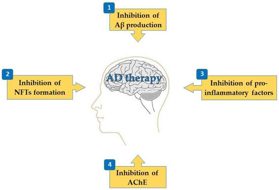 Among several strategies that have been identified to combat AD, multi-target drug ligands (MTDLs) represent an effective strategy for the treatment of this multifactorial disease, as compared to single-targeted agents and combined therapy [53]. For example, neuroinflammation and deficit of cholinergic activities are considered major contributing factors for AD. Thus, compounds that have activity against AChE and anti-inflammatory properties are multi-target compounds able to combat AD.