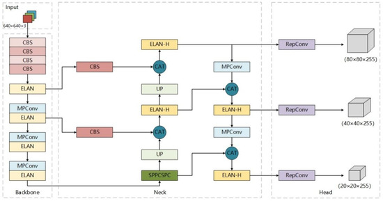 In general, YOLOv7 initially resizes the input image to 640 × 640, subsequently feeding it into the backbone network. The backbone of YOLOv7 primarily incorporates a CBS module, ELAN module, MPConv module and SPPCSPC module. The CBS module comprises a Conv layer, BN layer and SiLU activation function. ELAN modules effectively facilitate learning and convergence by controlling gradient paths, whereas deeper networks employ MPConv modules for downsampling. SPPCSPC utilizes both spatial pyramid pooling (SPP) and CSP structures to achieve richer gradient combinations. The enhanced feature extraction network implements multi-scale feature fusion and adaptive convolutional operations, enabling YOLOv7 to attain a significantly faster detection speed while maintaining high detection accuracy and meeting real-time requirements. Subsequently, the header network outputs three layers of feature maps of varying sizes, and the prediction results are ultimately generated via RepConv. The network structure of YOLOv7 is shown in Figure 4.