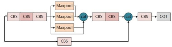 COT can simultaneously capture the above two spatial context relationships in the input key, increase the effective information in the feature map and improve the effective extraction of small scratch features on the surface of the photovoltaic module. Therefore, in this paper, a COT self-attention mechanism is added to SPPCSPC module, which can improve accuracy and does not produce a large amount of calculation. The improved SPPCSPC module is shown in Figure 6.