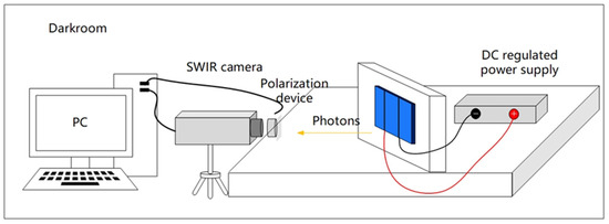 A time-multiplexed polarization imaging system was selected to capture the polarization images of small scratches on the surface of photovoltaic cells, as shown in Figure 7. Images of polarized light intensity in different directions were obtained by placing a rotatable polarizer in front of the imaging detector. The whole system is mainly composed of three parts: a shortwave camera, DC power supply, polarizer turntable and laptop computer with polarizing image acquisition software. The shortwave infrared camera model is Owl 640 S, featuring a response wavelength ranging from 900 nm to 1700 nm and an internal InGaAs sensor. The polarizer is a precision line grid polarizer, model 20LP-NIR, with an extinction ratio of 1000:1. The excitation power supply is a Goodyear 3030DD DC power supply, capable of providing a constant current output within a voltage range of 0–30 V and a current range of 0–3 A. The experimental object is a monocrystalline silicon solar cell sheet, measuring 156.6 mm × 156.6 mm with a thickness of approximately 0.1 mm. The scratches on the cell have a maximum length of 9 mm and a width of 1 mm. The positive and negative poles of the cell are led out with leads to facilitate connection to the DC regulated power supply.