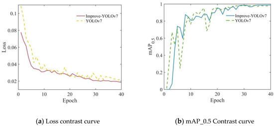 In the training process, Figure 8 compares the training loss and mAP_0.5 curves of both the original and improved YOLOv7 algorithms. The horizontal axis represents the training times, while the vertical axis in Figure 8a corresponds to the loss value and in Figure 8b to the mAP_0.5 value. Figure 8a demonstrates that the improved YOLOv7 algorithm converges faster and achieves a lower final loss value compared to the original algorithm. In Figure 8b, it is evident that the improved YOLOv7 algorithm exhibits less jittery and more stable mAP performance, resulting in a higher final value.