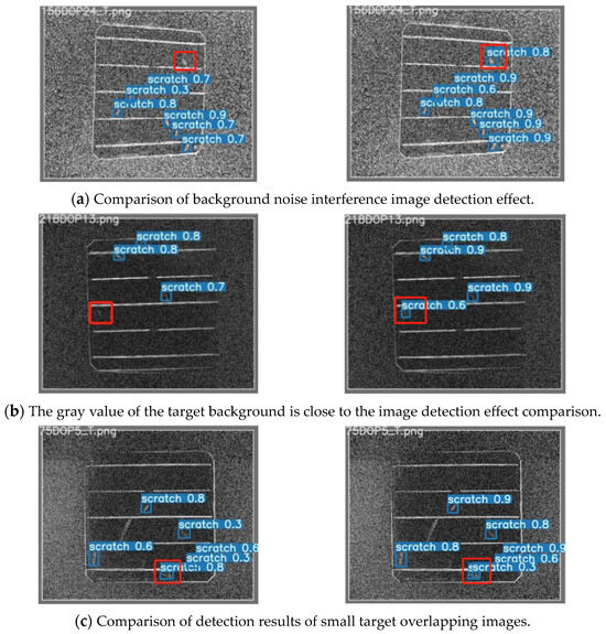 In order to verify the performance of the proposed algorithm in practical applications, pictures of three scenarios were extracted from the data test set and the proposed algorithm and the original YOLOv7 algorithm were respectively used for testing, as shown in Figure 9.