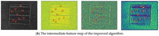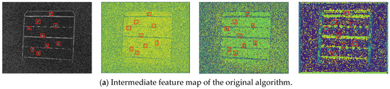 Figure 10 is a comparison between the middle feature map of the YOLOv7 model and the improved model. It can be seen from the figure that the edge outline of defects in the feature map becomes clearer after the COT self-attention mechanism module is added. The contrast between the defect and the background photovoltaic cell in the feature map is obviously improved.