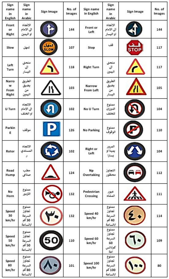 To our knowledge, there are two datasets for Arabic traffic signals: ArTS [16] and ATTICA [17]. A developed labeled dataset of images of Arabic traffic signs, known as ArTS, was created at Prince Mohammad Bin Fahd University in Al-Khobar, Kingdom of Saudi Arabia. Researchers can access it publicly. Applications pertaining to autonomous vehicles, traffic monitoring, and traffic safety can benefit from the dataset in various ways. Additionally, it can be helpful in creating applications for those who are blind or visually impaired and cannot read the signs. The photos were taken in Alkhobar and Dammam, two of the largest cities in Saudi Arabia’s Eastern Province. The captured images were for the 24 most common Arabic traffic signs that are described in Figure 1, such as Slow, Stop, No Parking, and others.
