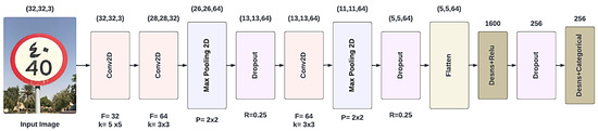 - Input Layer: Initial information entered into the model, where the pre-processed image is fed into the model. The input image is a three-channel image with input shape (32.32.3) that was captured by a camera on the road.