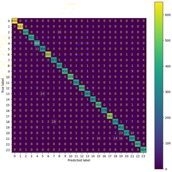 The performance of the proposed model was evaluated using some metrics such as accuracy, recall, precision, F1 score, and the confusion matrix [24,25]. Accuracy measures the accuracy of recognizing traffic signs, while precision measures the proportion between the true positives to the total number of detected signs. Recall measures the ratio of true positives to the total number of ground-truthed signs, and the F1 score combines precision and recall into a single metric: