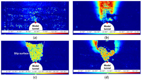The strata response in soil B is shown in Figure 6 and Figure 7. The process can be summarized into four stages. (1) Stage 1: after leakage initiates, soil and water start to rush into the tunnel, and seepage erosion of the surrounding soil starts. (2) Stage 2: due to the loss of soil and water at the top of the tunnel, an initial soil cave was formed above the tunnel, which temporarily remained stable. (3) Stage 3: the initial soil cave destabilized, and the soil above the cave collapsed rapidly. Subsequently, a secondary soil cave was formed and stabilized again. (4) Stage 4: the secondary soil cave destabilized and the soil above the cave, including the soil surface, subsided instantly and impacted the tunnel.