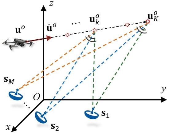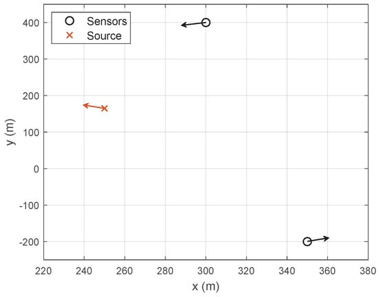Consider a scenario as shown in Figure 1 where M moving sensors are distributed in an N-dimensional space ( or ). The known initial positions and velocities of these sensors are denoted as and , respectively. These sensors are deployed to determine the position and velocity of a moving source. Assuming synchronization in time and frequency among the sensors, they can produce TDOA and FDOA measurements between receiving sensors and a reference sensor. Without loss of generality, the reference sensor is chosen as . The unknown initial position and velocity of the source are denoted as and , respectively, which will be estimated using TDOA and FDOA measurements. The velocities of the source and sensors are constant. During the motion of the sensors, the source is observed a total of K times, with a time interval of between the adjacent observation frame. Assuming the observation time is short, the sensors and source are considered as quasi-static during one observation frame. At the k-th observation frame, the positions of the sensors are denoted as
