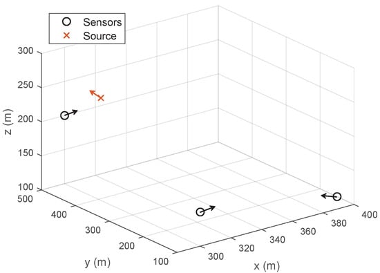 Figure 10 illustrates the RMSEs of the proposed solutions as the source range increases in 2D. Here, the arrival angle with respect to the origin is set to deg. Thus, the source’s initial position is denoted by