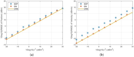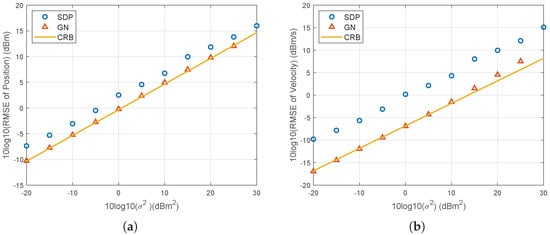 Similar to the simulations in the 3D scenario, this section evaluates the performance for the 2D case as the noise power increases. The initial position and velocity of the source are set to m and m/s, respectively. As illustrated in Figure 8, the GN algorithm can achieve CRLB performance when the noise power does not exceed 10 , while it encounters divergence issues when the noise power reaches . SDP provides 3 dB worse RMSE compared to the GN method, which is sufficient as an initialization.