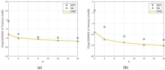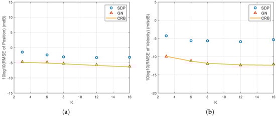The simulation also examines the RMSE of both the SDP and GN methods for the 2D scenario with respect to the number of observation times. As shown in Figure 9, the GN algorithm achieves CRLB performance as the number of observation times increases. The noise power is set to . It requires at least three observations to establish 6 equations, which is overdetermined for solving 4 unknowns.