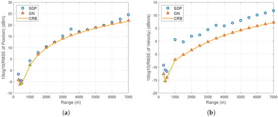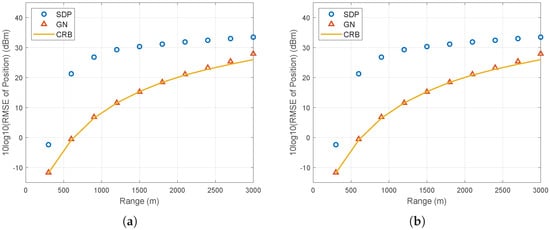 Let us further examine the RMSE of the proposed SDP and GN methods as the source range increases. The initial position of the source is oriented with azimuth and elevation deg and deg relative to the coordinate origin. The source’s initial position is calculated as