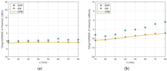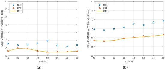 Let us begin by testing the 3D case. As shown in Figure 2, the scenario comprises 3 sensors utilized to locate a moving source, where the noise varies from to . The initial positions and velocities of the sensors are listed in Table 3. The source is initially observed from m with a velocity of m/s. The number of observing times is . The RMSEs of the SDP and GN methods and the corresponding CRLB are shown in Figure 3. The GN method achieves a CRLB accuracy if the noise is not larger than . However, when the noise is at , the GN method encounters divergence problems since the estimation results from SDP are too far from the true values. The RMSE of these estimations using the SDP method fails to attain the CRLB since the effectiveness of the penalty terms is limited when only three sensors exist. This limitation hinders the transformed problem from accurately approximating the original problem and renders the SDP method suboptimal.