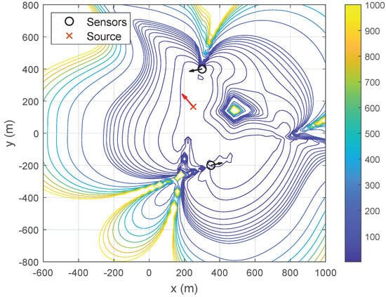 The GDOP contour for the 2D scenario is presented to evaluate the theoretical performance of the proposed method. The sensor configuration and the velocity of the source are similar to those depicted in Figure 7. As illustrated in Figure 12, in the 2D scenario, the localization accuracy remains high when the source is nearby but deteriorates significantly as the source moves farther away.