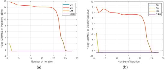 It is demonstrated in Figure 13 that the GN and LM methods converge to the CRB after only two iterations on average. Additionally, these two methods exhibit similar performance since their convergence curves coincide. However, the QN method requires 26 iterations to converge. Table 5 demonstrates that the processing times of the proposed GN method are significantly lower than those of the LM and QN methods.