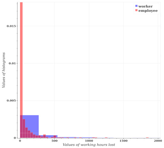 In the context of non-fatal accidents, the primary predictive objective is to anticipate the duration of recovery for the injured individual, which varies between workers and employees. This distinction arises from the distinct nature of the recovery process for each group, influenced by the nature of their respective tasks. As depicted in Figure 1, the distributions of recovery duration for workers and employees exhibit noticeable differences, aligning with expectations due to the higher incidence of severe accidents in manual labor settings. The used approach involved developing a unified model capable of discerning both shared patterns and unique characteristics between these two groups. However, it is important to remain cognizant of the potential need to construct separate, more distinct models tailored to each group’s specific attributes in future iterations.