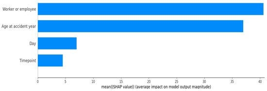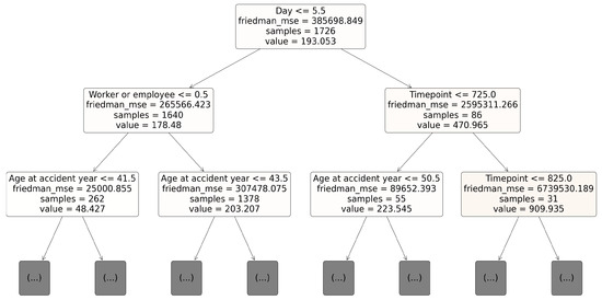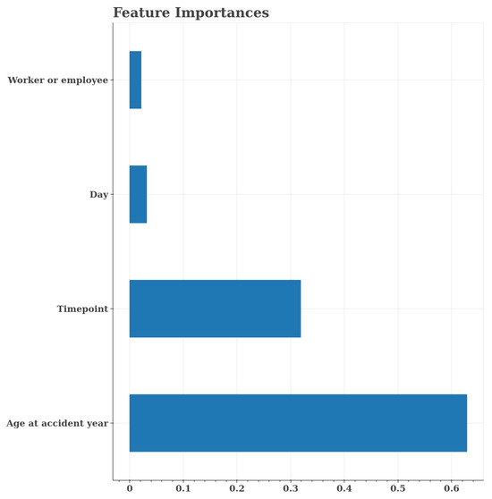 After evaluation on the test set utilizing four features—specifically, the individual’s age at the time of the accident, the day of the week, the time of day, and the classification as a worker or an employee—the decision tree showed a Mean Squared Error (MSE) of 151,222.99 and a Relative Root Mean Squared Error (RRMSE) of [4]. The significance of these input features is consistent with previous research findings [7,19], as illustrated in Figure 3.